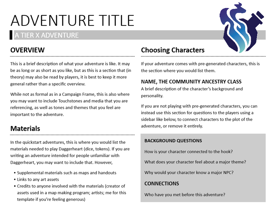 Templates for building custom Daggerheart™ Compatible adventures, based on the style and structure used in the Quickstart Adventure Sablewood Messengers and Marauders of Windfall.